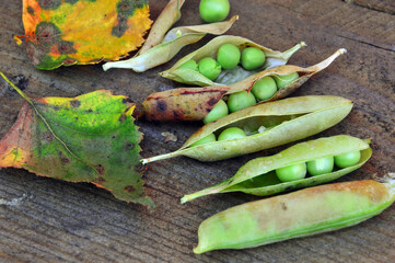 Fresh green peas in open pods, Organic pea pods with bright green peas inside