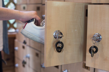Stage equipment behind the scenes. Concert activity. Cases for transportation of equipment. Boxes on the wheels.