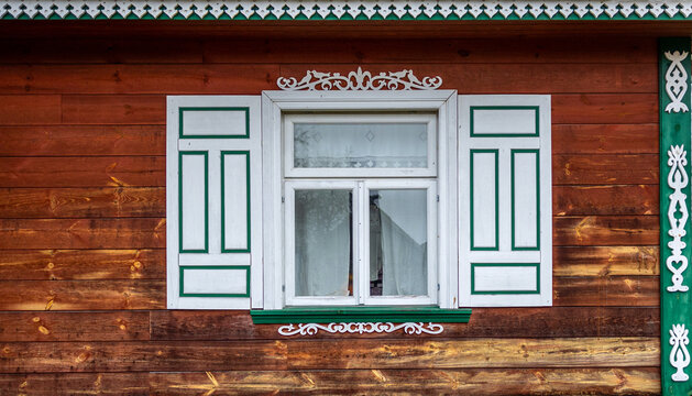 Beautiful old window frame with white wooden shutters and pale white wall.  Rural antique window frame. Design element. Template or mock up.