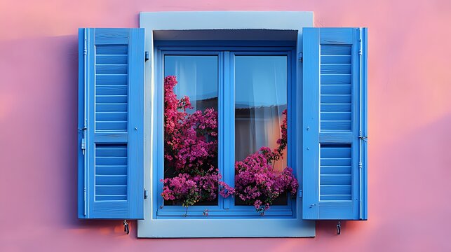 A Partially Open Window with Blue Shutters Reveals a Glimpse of the Sun Through a Lace Curtain and a View of Nature Beyond
