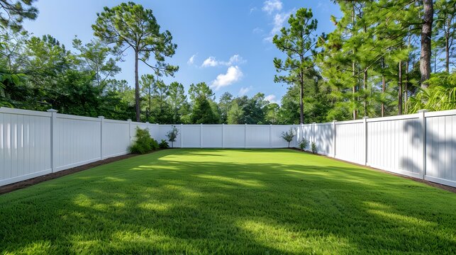 A photo shows a white vinyl fence around a backyard with green grass, trees and a blue sky.