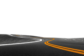 Winding asphalt road with a black background.  A grayscale landscape curves into a dark abyss.  Yellow lines mark the roadway
