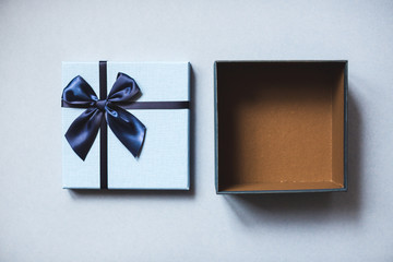 Blue open gift box top view.