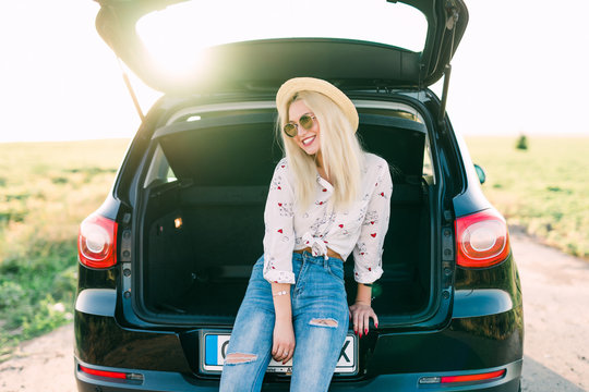 Woman sitting in back of car smiling. Getting ready to go. Young laughing woman sitting in the open trunk of a car. Summer road trip. Young woman sitting in the car trunk