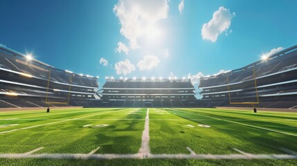 Golden sunlight illuminates soccer field at sunrise with long shadows and peaceful cloud patterns Generative AI