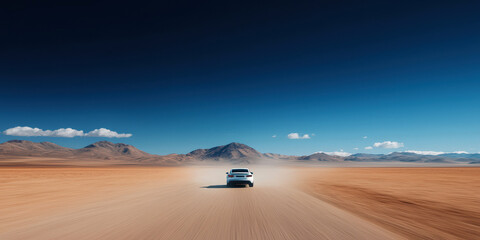 A car drives down a dusty road through a vast desert landscape, surrounded by mountains under a clear blue sky.