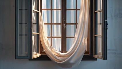Photorealistic image of a opened window with fluttering curtain