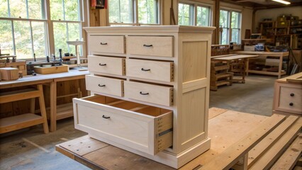 A stack of openframe cabinetry drawers their edges softly rounded waiting for a pop of color in a cozy workshop illuminated by natural light.