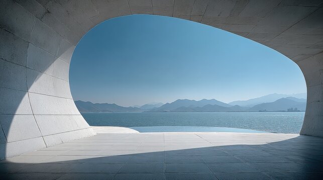 Modern architectural structure with large open window overlooking scenic mountain landscape