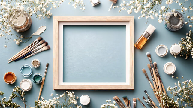 Flat lay of artist tools and square frame with brushes, paints, flowers and palette on a blue background