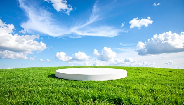 White circular platform on green grass under blue sky with clouds