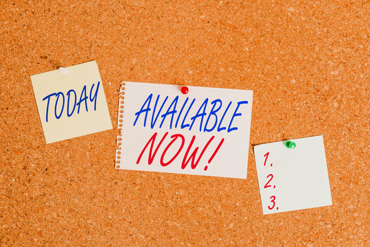 Text sign showing Available Now. Business photo showcasing you can find it obtain or operable at this current moment Corkboard color size paper pin thumbtack tack sheet billboard notice board