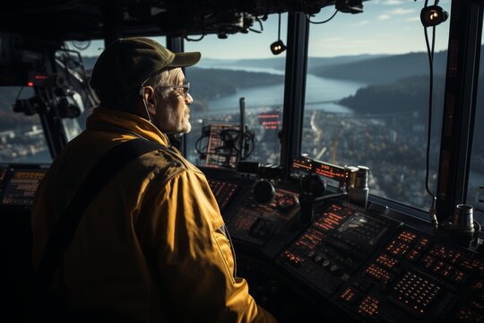 Man in hard hat and gloves operates boat hoist control panel in a modern marina with a focused expression on a calm day