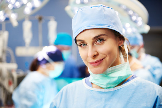 Surgeons in scrubs preparing for surgery in hospital operating room