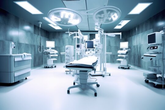 A sterile hospital operating theater with advanced technology, minimalist design, and bright lighting creating a clean, organized environment.