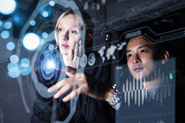 Two persons looking at graphical user interface. Futuristic business concept.