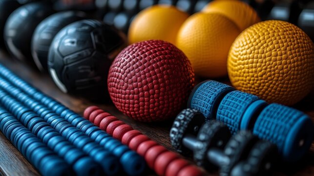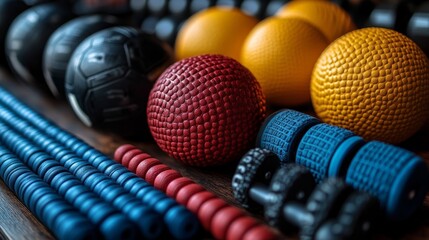 Diverse fitness tools are neatly arranged, highlighting unique textures for effective workouts and therapy