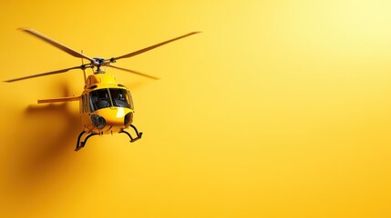 A vibrant yellow helicopter hovering against a clear yellow backdrop, illustrating its role in emergency services or aerial support in a captivating visual format.