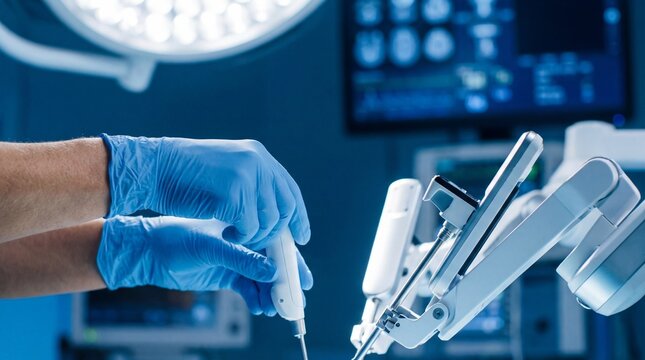 Close-up of surgeon's hands in sterile gloves operating a high-tech robotic surgery console in a modern medical theater.