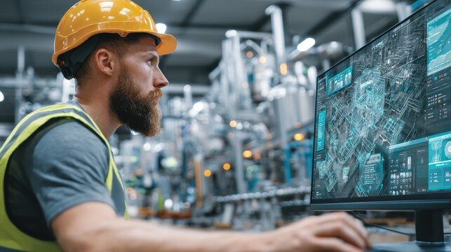 Worker in safety gear analyzing data on a computer screen in a modern industrial facility