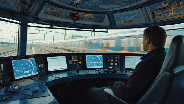 Realistic scene of an electric train driver operating the control panel, modern cockpit