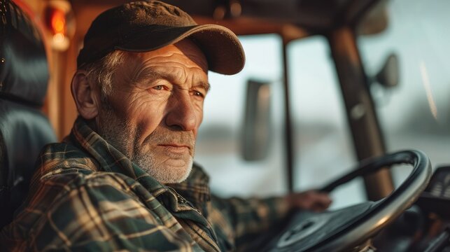 Experienced truck driver sitting in vehicle cabin wearing safety gear