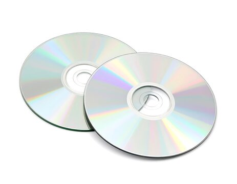 Two reflective, silver optical discs stacked at a slight angle on a bright white background, capturing their iridescent surfaces