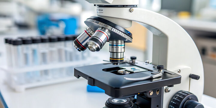 Close-up of a modern optical microscope in a sterile laboratory with a blurred female scientist working in the background. Professional medical equipment for pathology research and diagnosis.