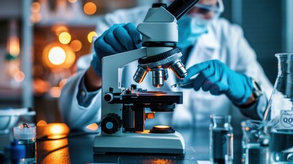 Close up shot of microscope equipment with metal lens in laboratory. Researcher hands in rubber gloves using a dropper and microscope to study a sample for developing a new drug and new substance.
