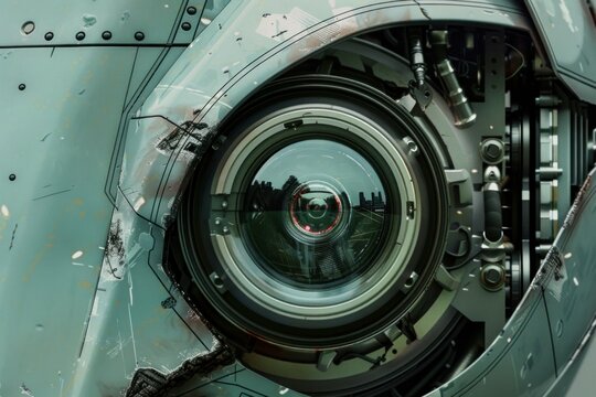 Detailed view of a hightech optical sensor on military aircraft with reflective cityscape