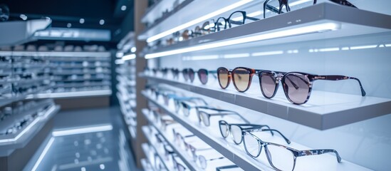 Glasses shop. Optical salon. Different multi-colored frames for eyeglasses in the shop window