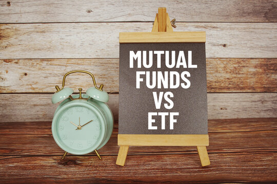 Mutual funds vs ETF text on easel blackboard with alarm clock on wooden background