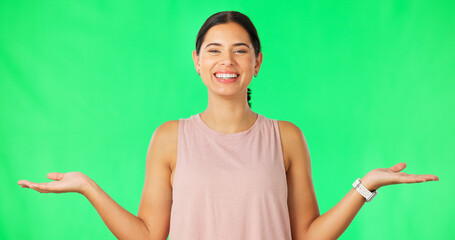 Decision, comparison and happy woman with mockup studio choice, scale option or palm product placement. Portrait presentation, marketing space and female balance mock up isolated on green background