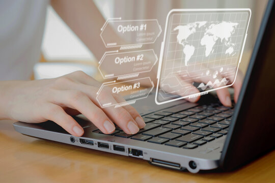 A Businesswoman use laptop for management data option to succeed on virtual screen.