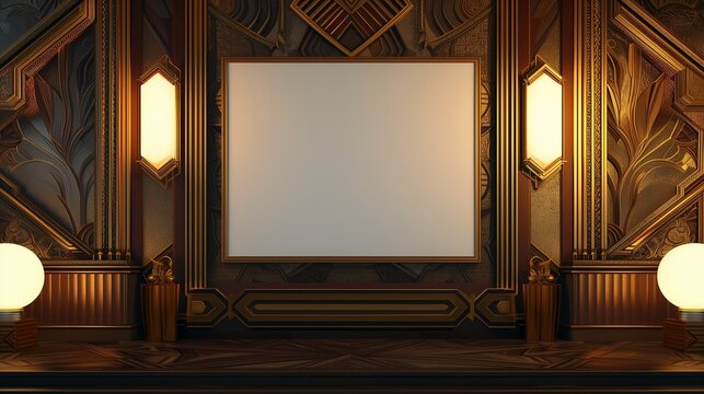 An art deco-inspired TV hall featuring an empty canvas frame on a wall with lavish gold accents, lit by the glamorous light of art deco style lamps.