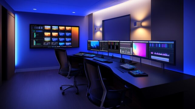 Modern editing suite with multiple monitors displaying colorful video content in a dimly lit room