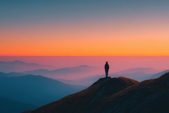 View from the summit as a person stands on a mountain ridge at sunset, gazing over layers of distant hills and a colorful sky filled with hues of orange and purple