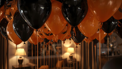 Halloween party decorations with black and orange balloons hanging from the ceiling.