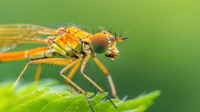 Cute cartoon insect character walking in nature, whimsical orange bug with wings holding a leaf, playful and imaginative fantasy scene.