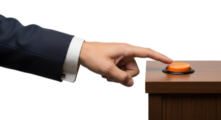 A hand pressing a glowing orange button on a dark surface illuminated by the button's light source