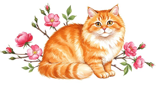 Gentle Orange Cat Amidst Delicate Pink Blossoms: Watercolor Painting