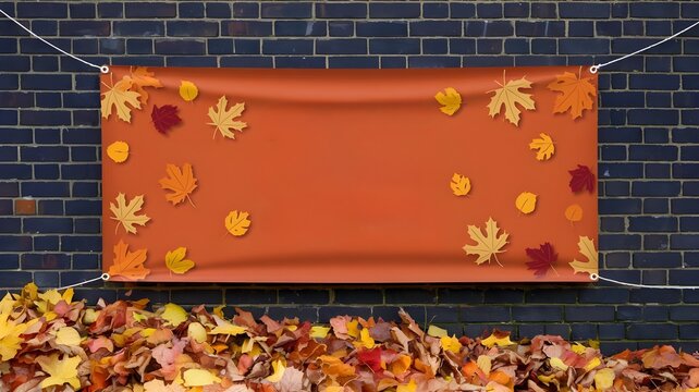 A big empty orange cloth is being hanged along with bunch of autumn leaves for business promotion