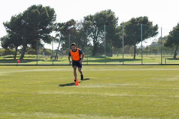 Male athlete sprinting on sports field under sun wearing orange training bib dodging orange cone