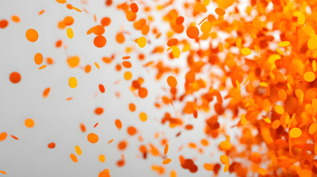 Vibrant orange confetti floats against a soft bokeh backdrop, creating a joyful and festive atmosphere filled with light and energy.