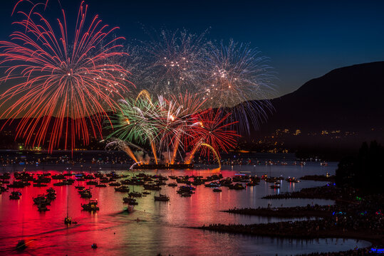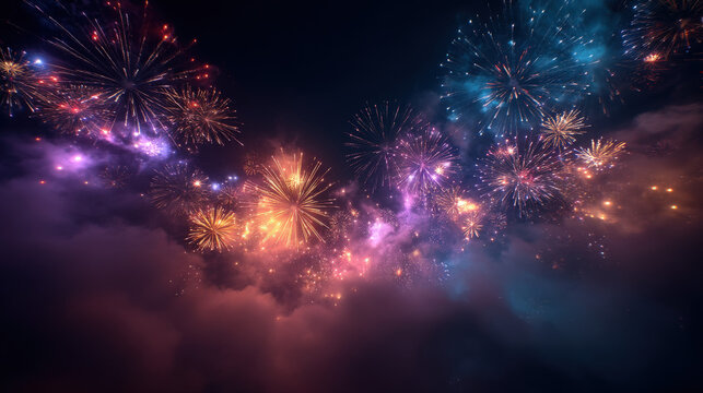 A breathtaking spectacle of vibrant fireworks exploding against a dark night sky, creating a mesmerizing display of colorful bursts and smoky trails.