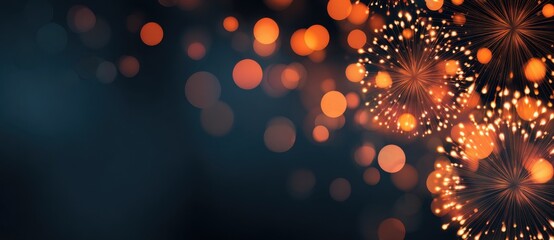 Golden orange fireworks explosion with bokeh light effects on dark blue background. Festive celebration concept for New Year.
