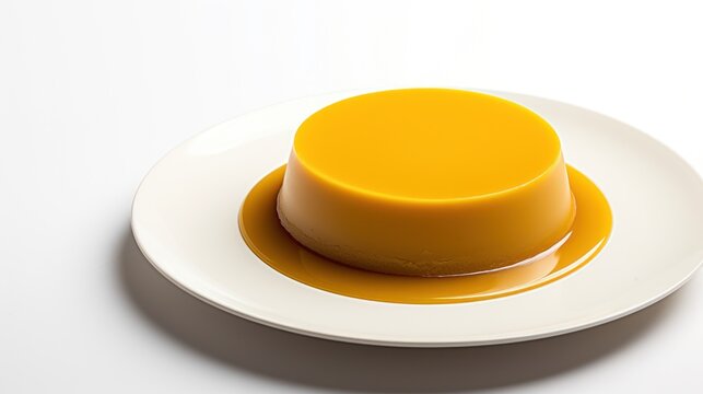 Creamy caramel flan on white plate with smooth texture