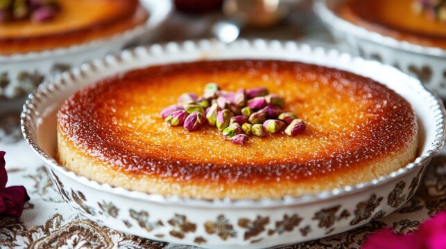 Delicious flan dessert on white plate