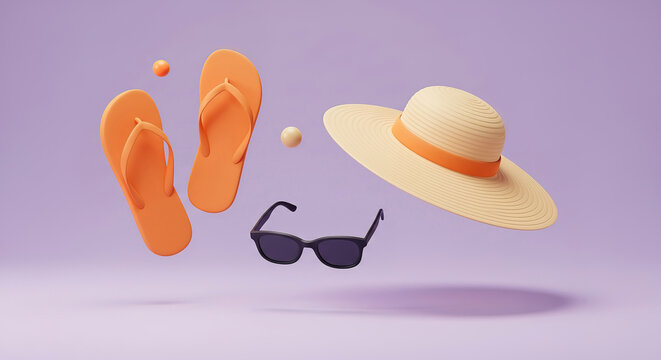 Summer essentials featuring orange flip flops, a wide-brimmed hat, and black sunglasses floating on a purple background