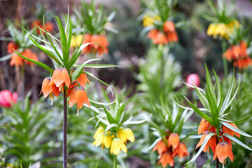 Close-up of orange fritillaria imperialis flowers blooming in a spring garden outdoors